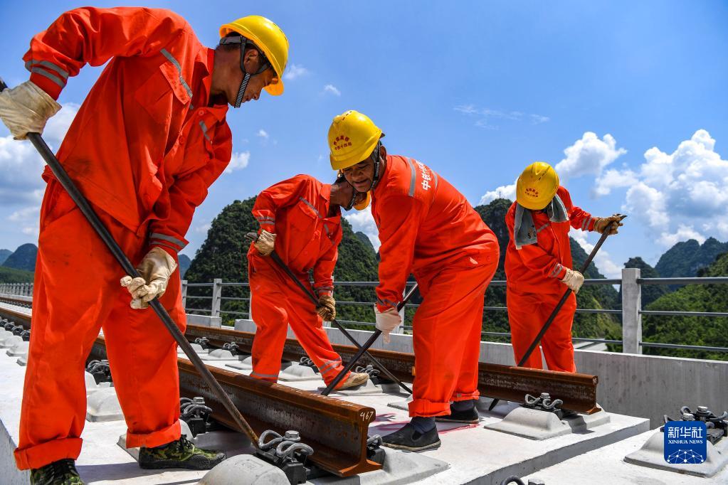 當日,在廣西河池市,一臺鋪軌機將一段500米長鋼軌鋪設在貴南高鐵龍江雙線特大橋的無砟道床上,標志著貴南高鐵正式進入鋪軌階段。建設中的貴南高鐵是我國“八縱八橫”高速鐵路主通道包頭至??谕ǖ赖闹匾M成部分,設計時速350公里。