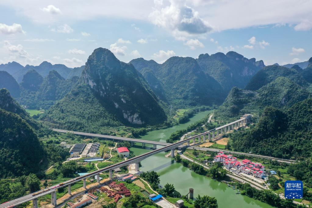這是8月16日拍攝的貴南高鐵廣西段龍江雙線特大橋(無人機照片)。