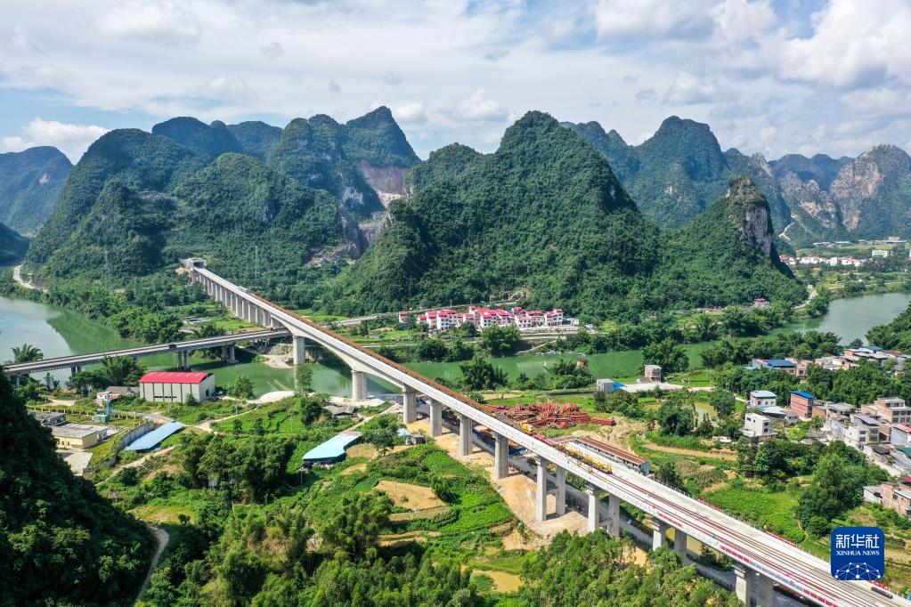 這是8月16日拍攝的貴南高鐵廣西段龍江雙線特大橋(無人機照片)。