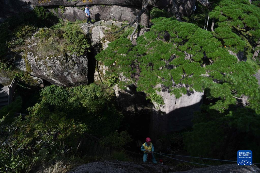 8月15日,李培生(下)在黃山風景區的懸崖峭壁間清撿垃圾,胡曉春(上)在迎客松附近巡查。