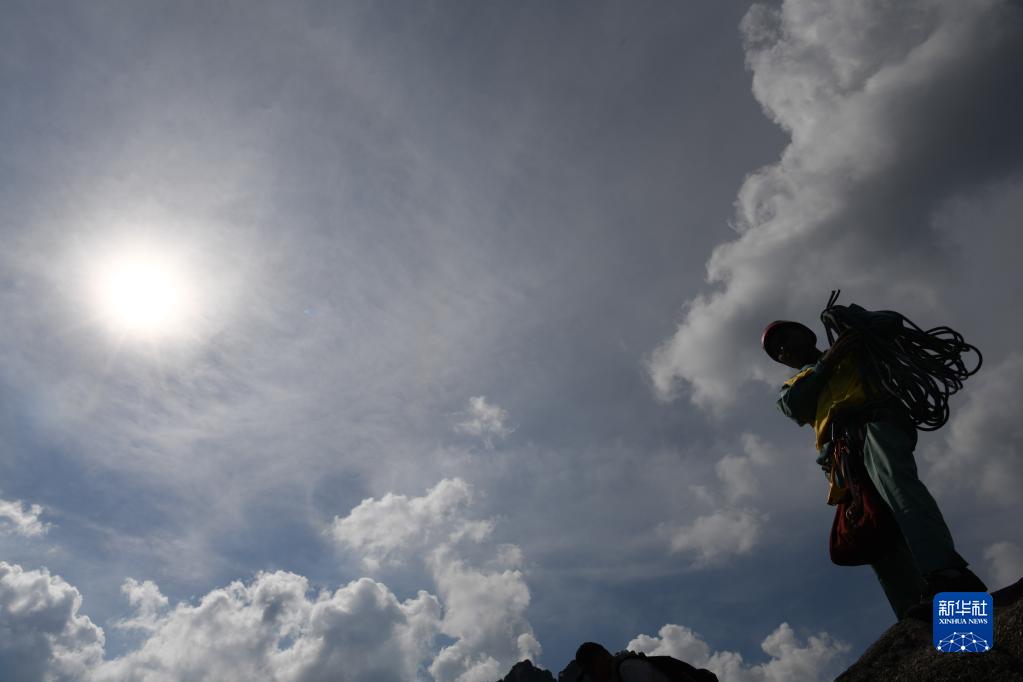 8月14日,李培生在黃山風景區的懸崖峭壁間清撿完垃圾準備離開。