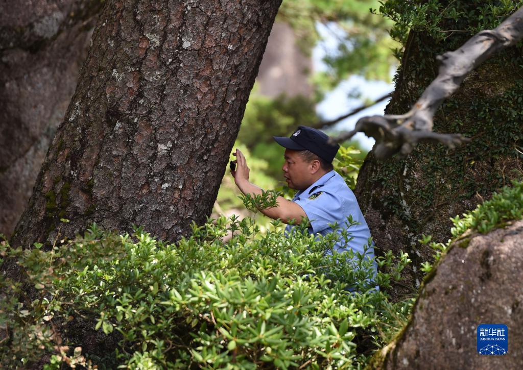 8月14日,胡曉春用放大鏡檢查迎客松的樹皮和紋理,以便及時發現病蟲害。