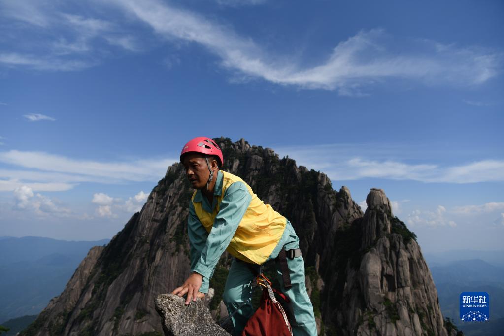 李培生是黃山風景區玉屏環衛所的一名放繩工。他常年攀爬在懸崖峭壁間清理垃圾或幫助游客撿拾失物,在責任區內與同事一起巡查清撿。20多年來,李培生累計放繩長度達1800公里,相當于200多座珠穆朗瑪峰的高度。