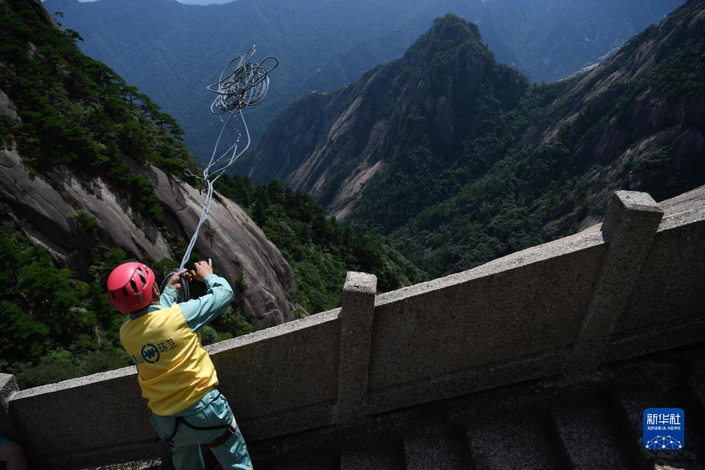 8月14日,李培生在黃山風景區放繩準備清撿垃圾。