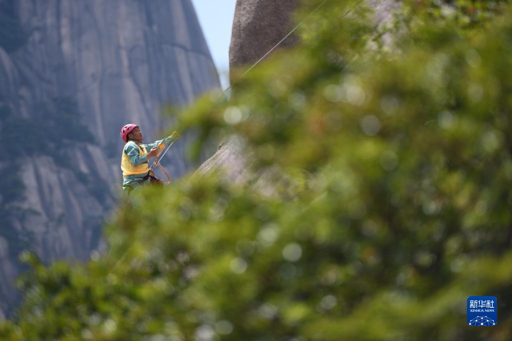 云海、奇石、迎客松……黃山上的這些風景令許多游客印象深刻。在游玩時,大家也許還會遇見這樣一些人:他們或拿著設備獨自守護在迎客松旁,或在峭壁上攀爬清理垃圾……他們日復一日地守護著美麗的黃山。