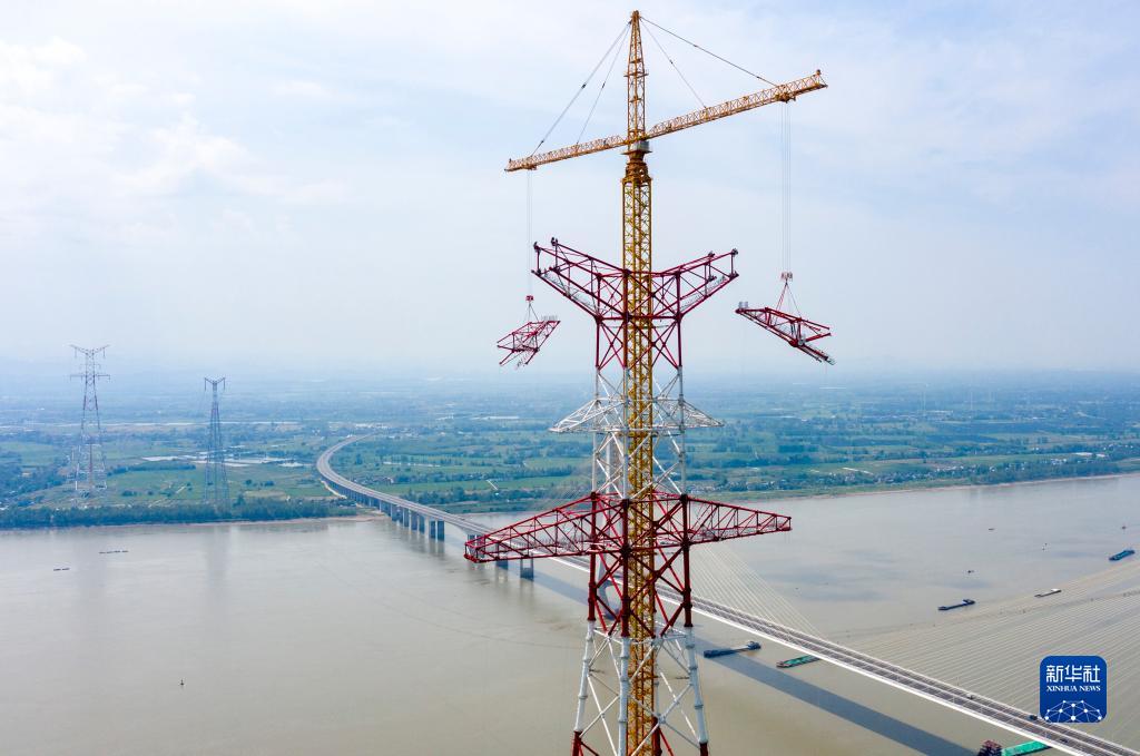 白鶴灘至浙江特高壓直流輸電工程安徽段長江跨越塔全部組立完成