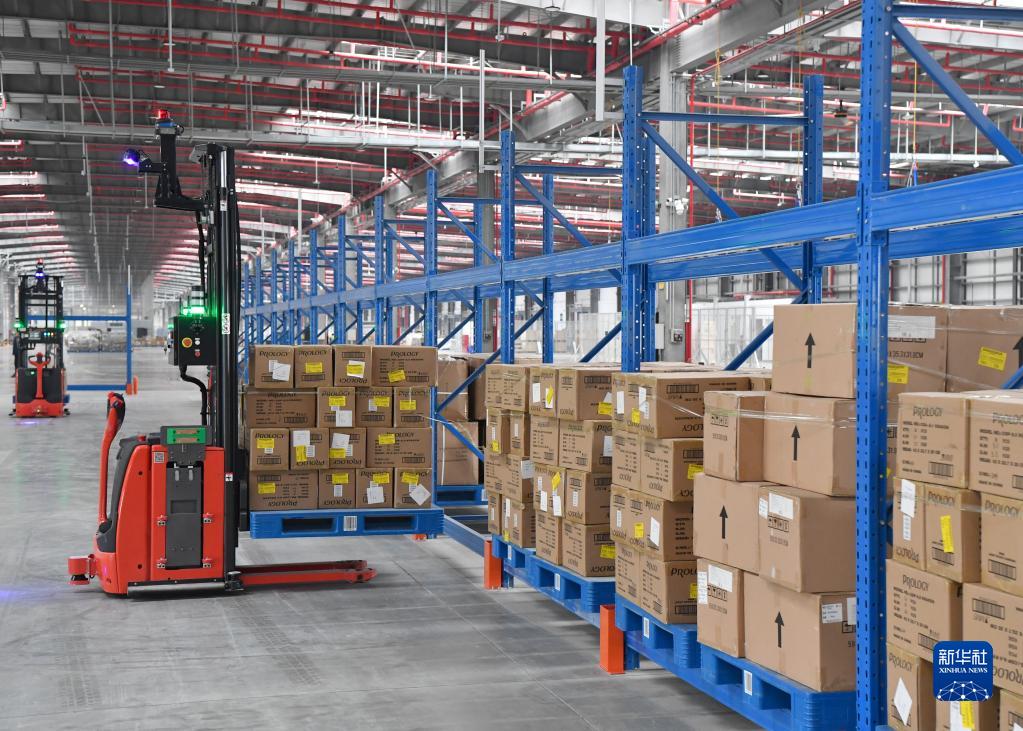 8月16日,在鄭州機場北貨運區倉庫,自動化導引叉車在作業中。