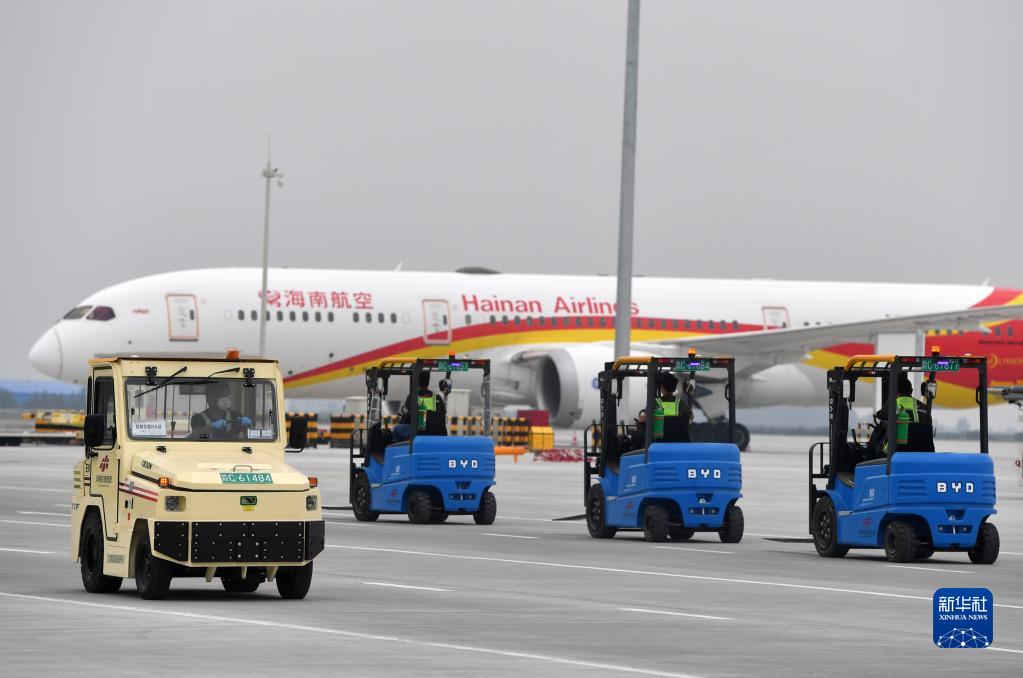 8月16日,在鄭州機場北貨運區飛行區,工作人員駕駛牽引車及叉車,準備裝貨。