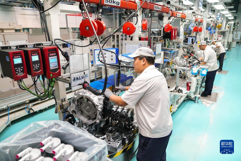 在哈爾濱東安汽車動力股份有限公司生產車間,工人在生產作業(8月16日攝)。