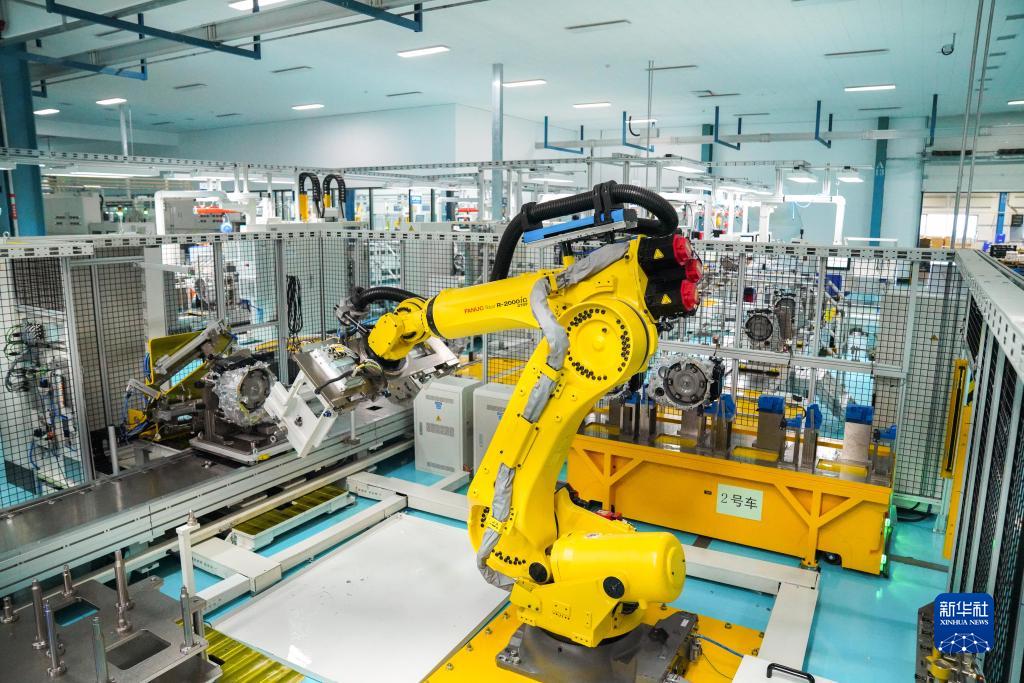 在哈爾濱東安汽車動力股份有限公司生產車間,一臺機械臂在生產作業(8月16日攝)。