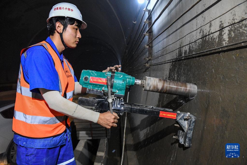 8月16日,在位于廣西環江毛南族自治縣的貴南高鐵九萬大山四號隧道內,技術人員進行取芯作業。