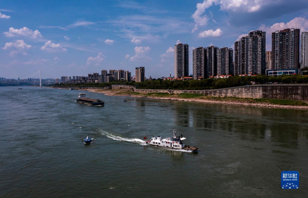 8月16日,長江重慶航道局巴南航道處的一艘航道工作船在轄區的長江水域上進行巡查作業(無人機照片)。