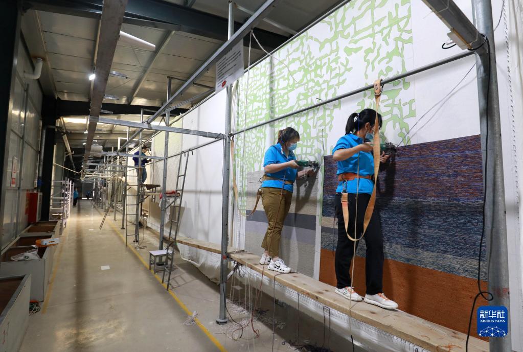 8月17日,在河北省石家莊市行唐縣一家外貿地毯生產企業,工人在手工織制地毯。
