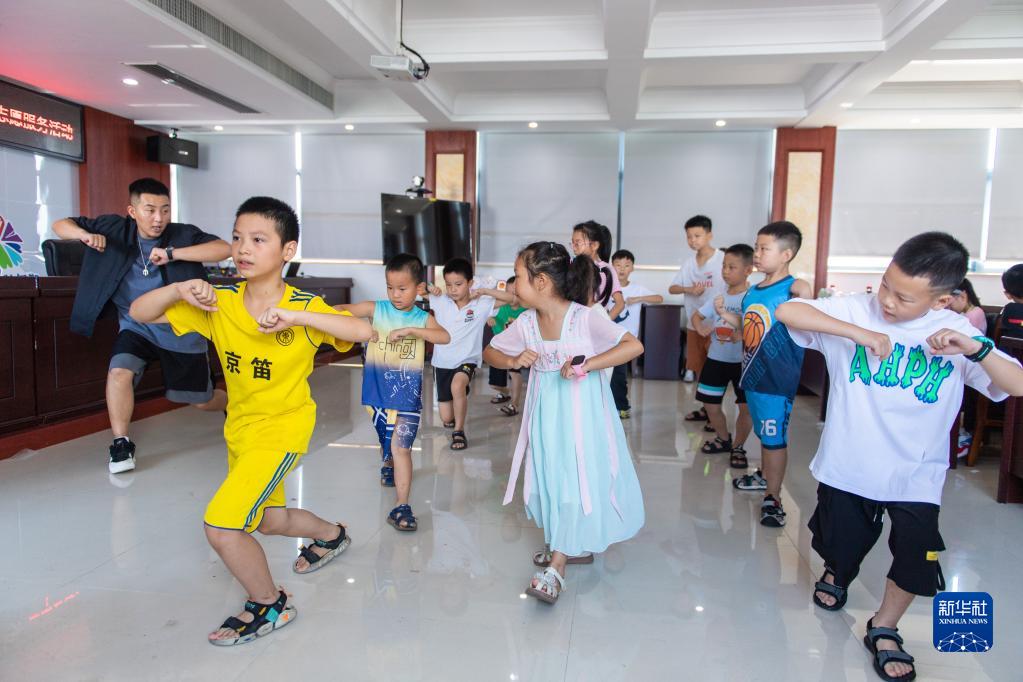 8月17日,在湖南省常德市武陵區南坪街道竹根潭社區活動室,志愿者(左一)在舞蹈課上教學生跳舞。