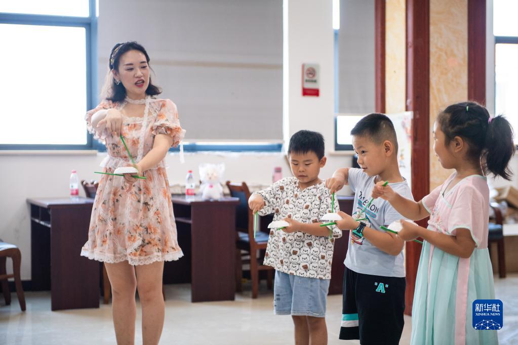 8月17日,在湖南省常德市武陵區南坪街道竹根潭社區活動室,志愿者在絲弦課上教學生練習常德絲弦的打碟技藝。
