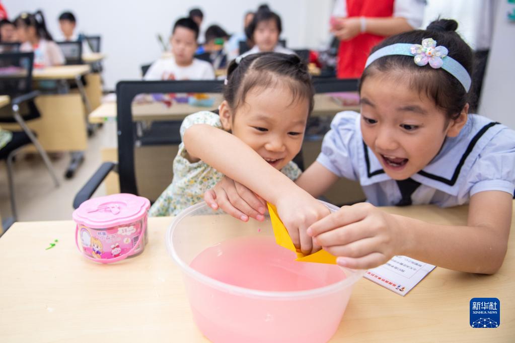 8月17日,在湖南省常德市武陵區芙蓉街道新時代文明實踐所活動室,學生在手工課上把折好的紙船放進水盆。