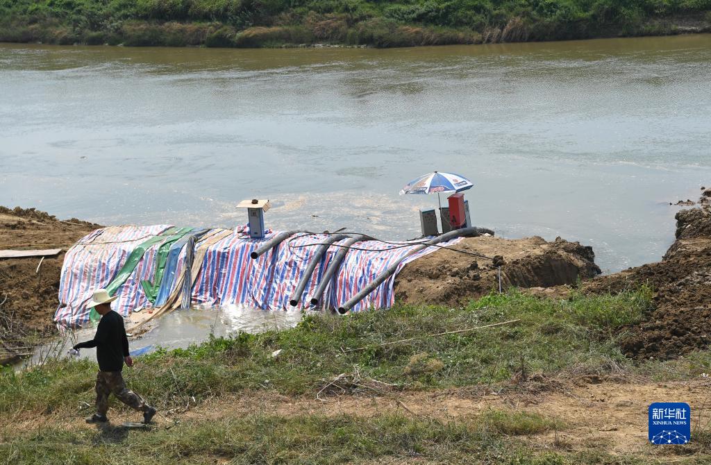 8月17日,在江西省廬山市沙湖山管理處長湖管理站,工作人員用水泵將河水抽入水渠灌溉農田。