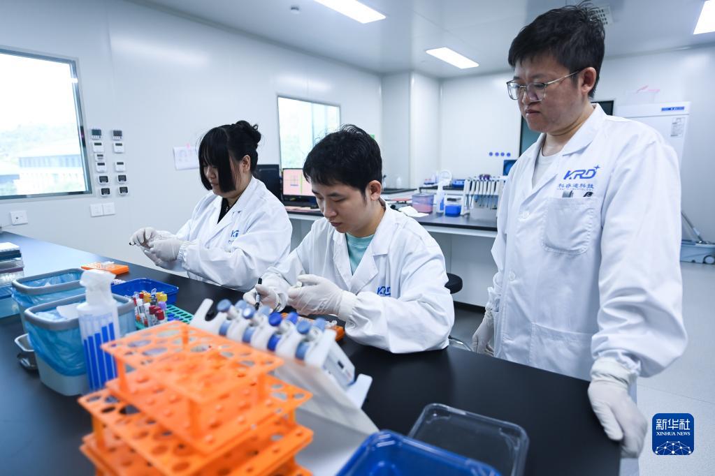8月17日,在杭州科睿迪智檢醫學檢驗實驗室有限公司的實驗室里,檢驗師郭成忠(右一)帶著年輕員工做實驗。這是一家專業從事醫學檢測與科研轉化的高科技企業,通過政府部門的牽線搭橋,成為當地醫學院科研實習基地。