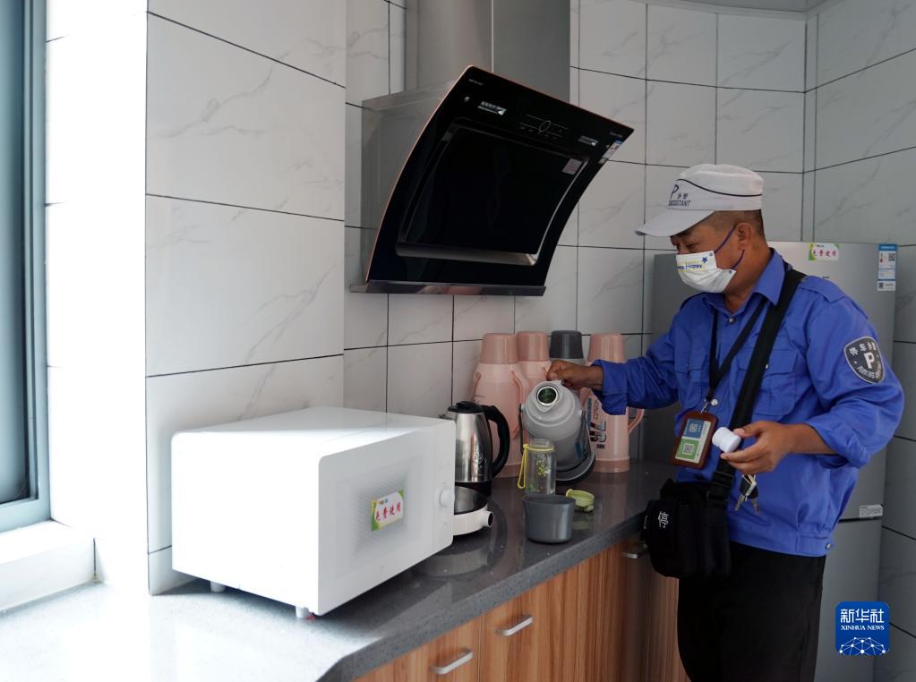 8月16日,一名道路停車管理員在愛心驛站添水。