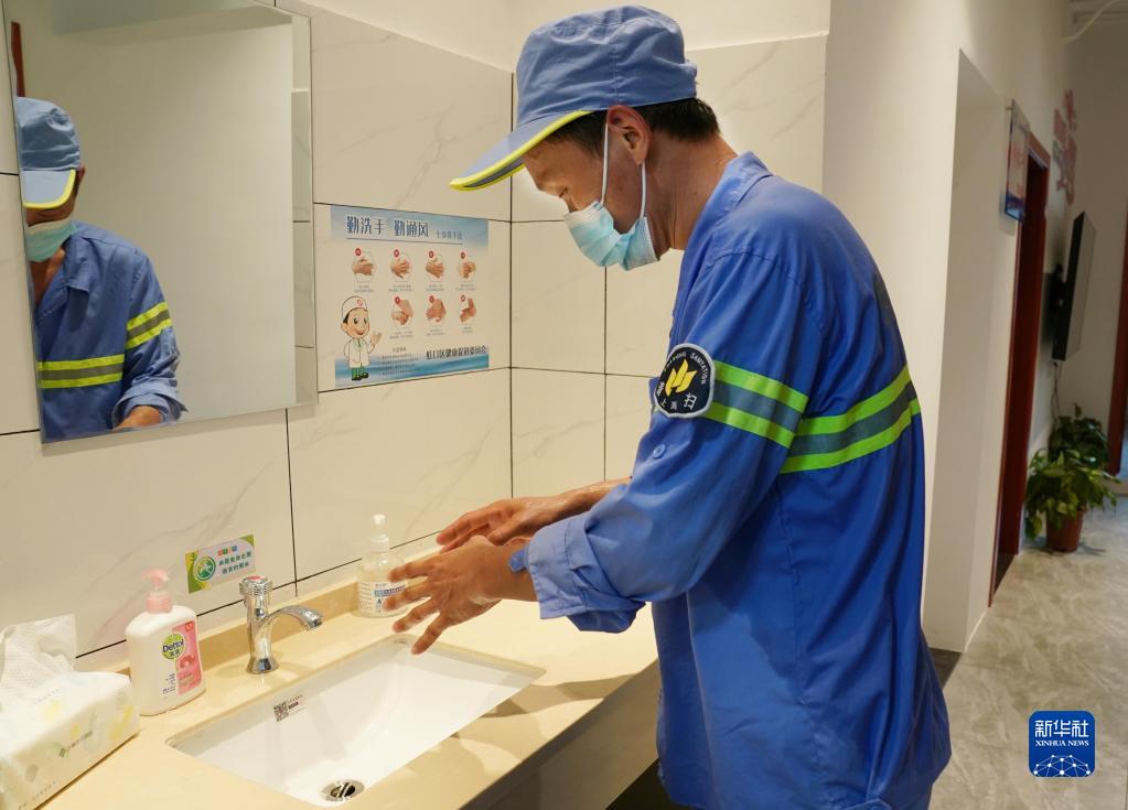 8月16日,來愛心驛站休息的環衛工人冉景濤在水池前洗臉,他的上衣已被汗水浸透。