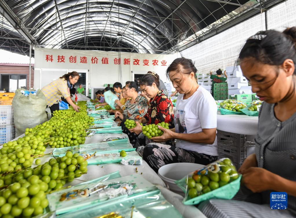 8月17日,在四川省眉山市彭山區公義鎮,工人將收獲的葡萄裝袋。