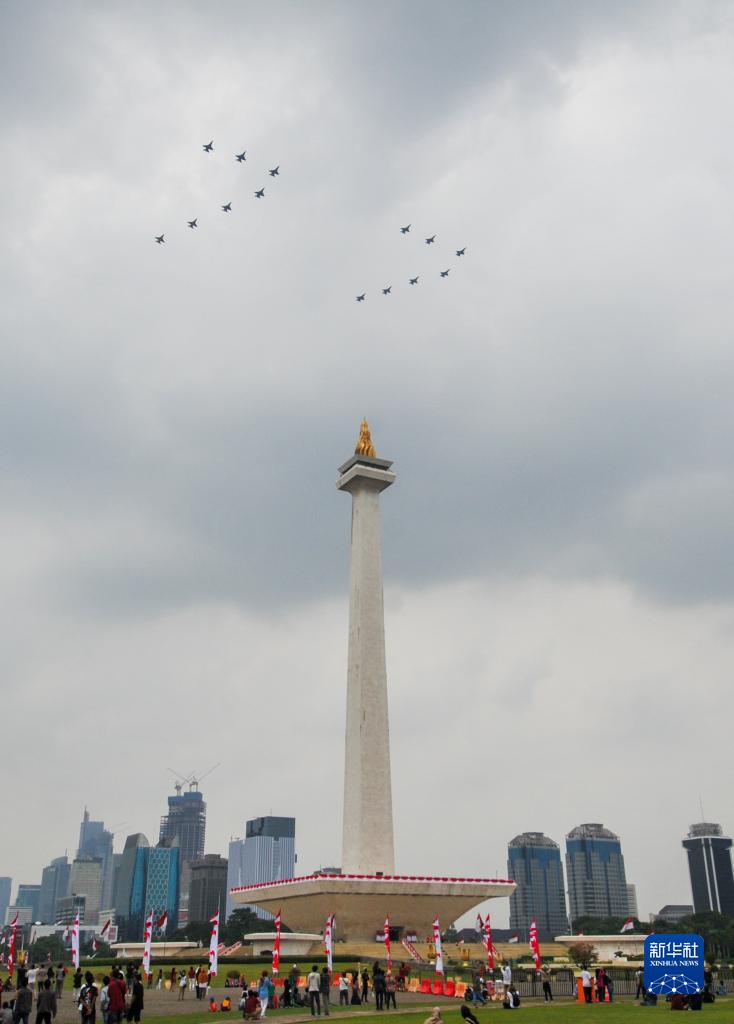 8月17日,印度尼西亞空軍飛機編隊呈“77”字樣飛過首都雅加達的民族獨立紀念碑上空。