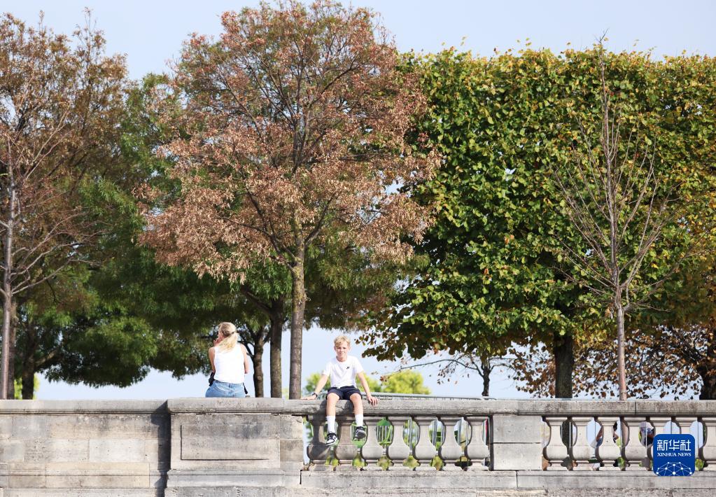 8月17日,一對母子在法國巴黎杜勒里花園小憩,部分樹葉泛黃干枯并脫落。
