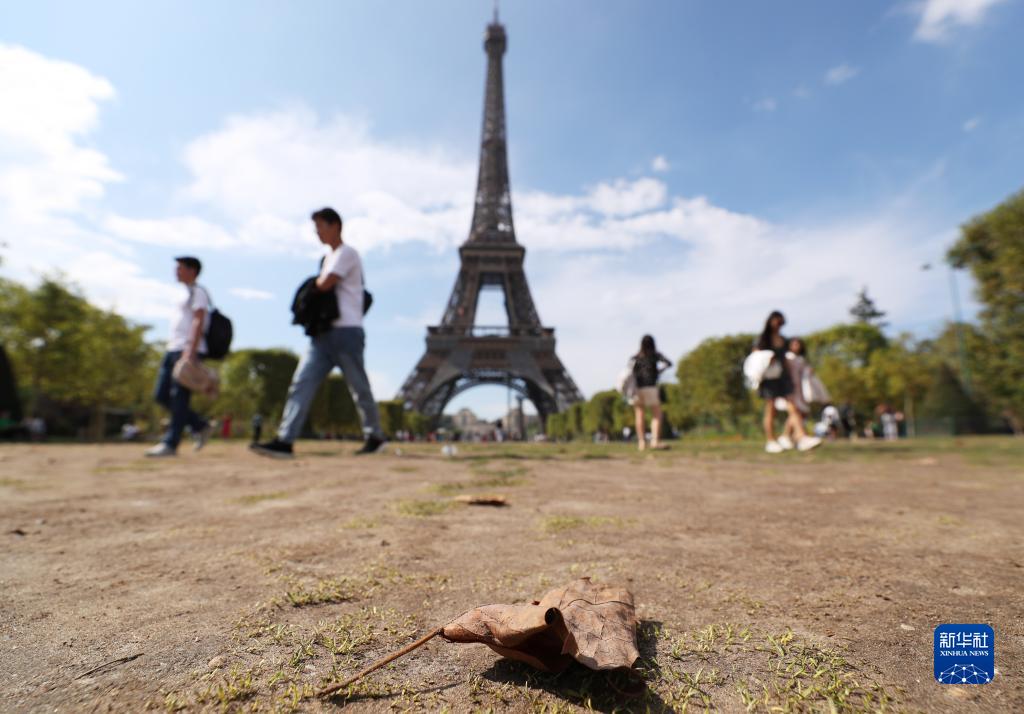 這是8月17日在法國巴黎戰神廣場拍攝的干枯的草坪和干枯脫落的樹葉。