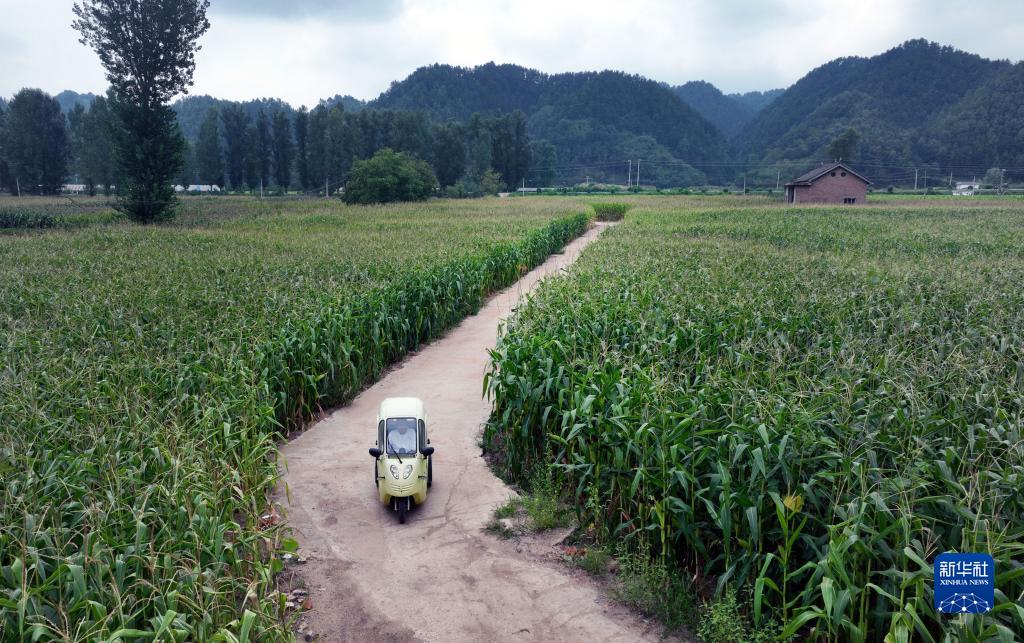8月17日,村醫牛薛武駕駛殘疾人專用電動車,行駛在鄉道上(無人機照片)。