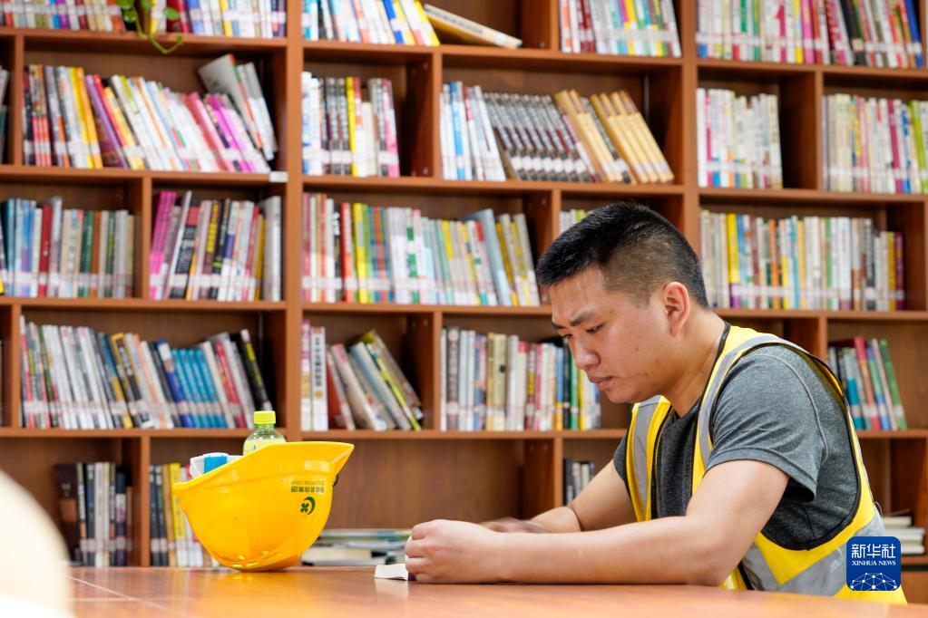 8月17日,重慶市九龍坡區謝家灣街道萬象城的工會戶外勞動者服務站內,一名建筑工人在服務站圖書角看書。
