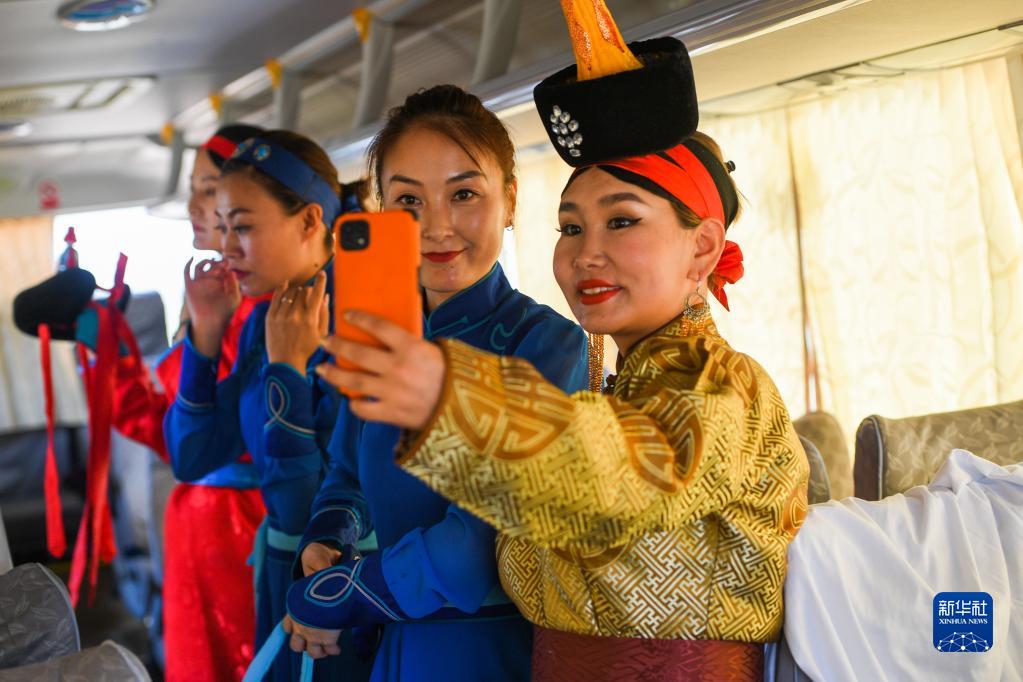 8月17日,在敦達烏蘇嘎查演出點,烏蘭牧騎隊員穿戴好演出服裝后合影。