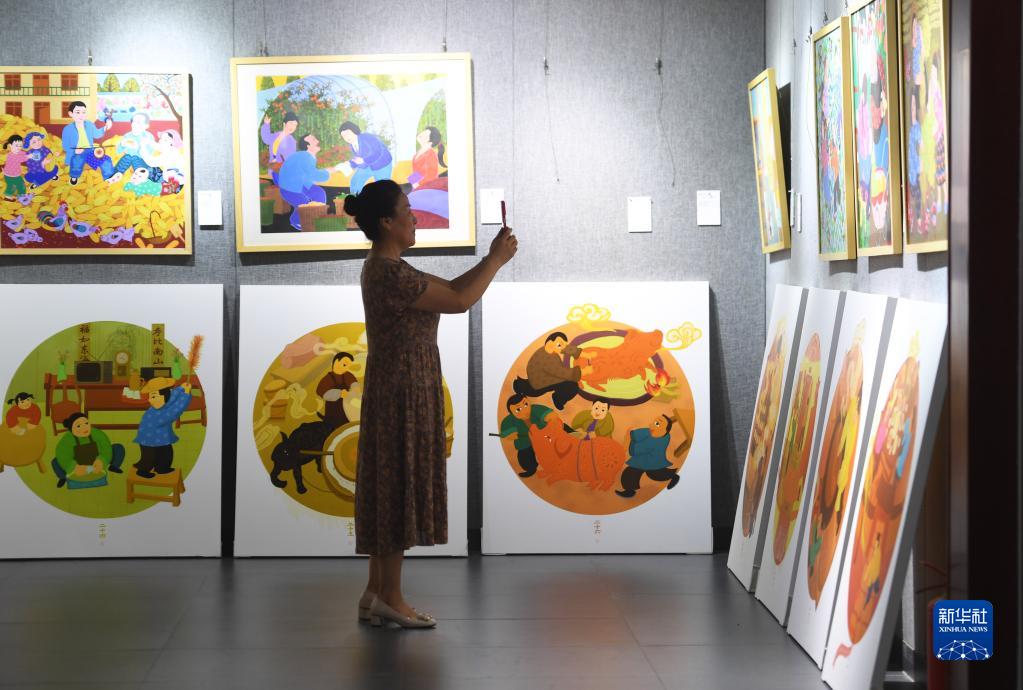 8月18日,在河南省漯河市舞陽農民畫院,觀眾在農民畫展覽上拍照。