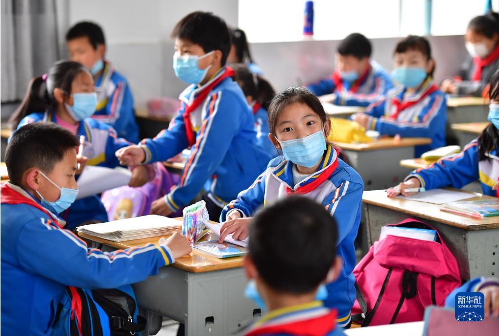 在老縣鎮中心小學寬敞明亮的教室內,學生在課間休息(2020年4月22日攝)。