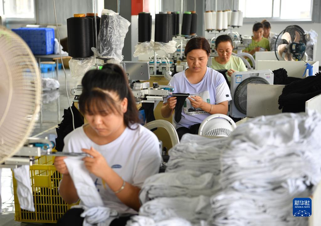 8月17日,老縣鎮一家織襪社區工廠的工人在車間內忙碌。