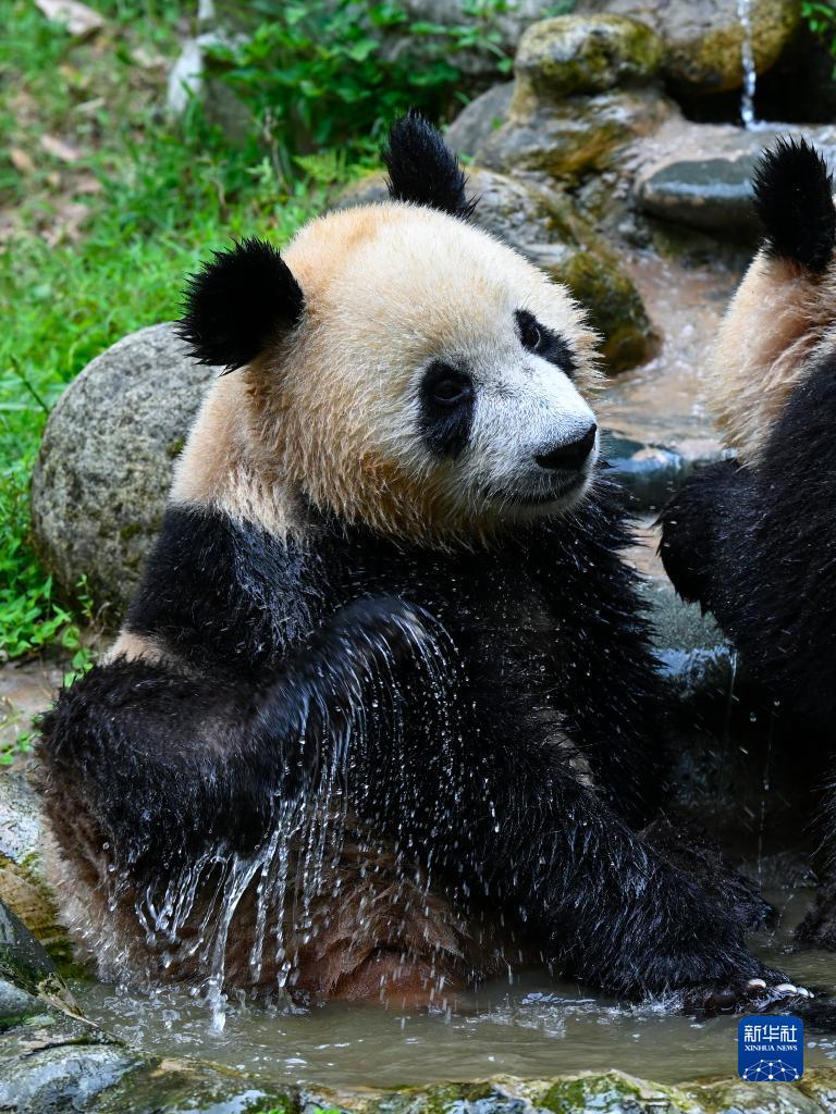 8月18日,中國大熊貓保護研究中心都江堰基地的大熊貓在圈舍的水池里戲水玩耍。