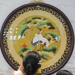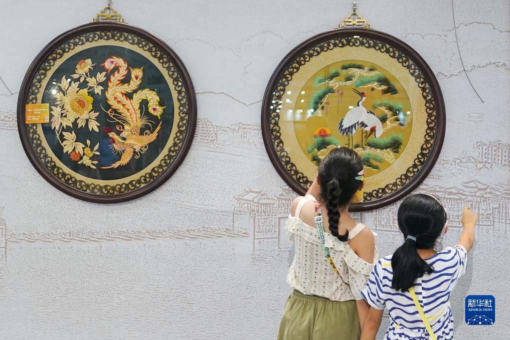 8月18日,觀眾在第二屆中國工藝美術博覽會參觀織繡類藝術展品。