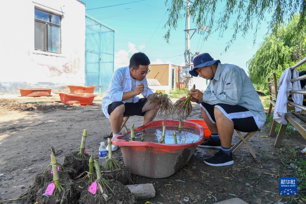 8月17日,沙野(左)和崔帥清理玉米根樣本。