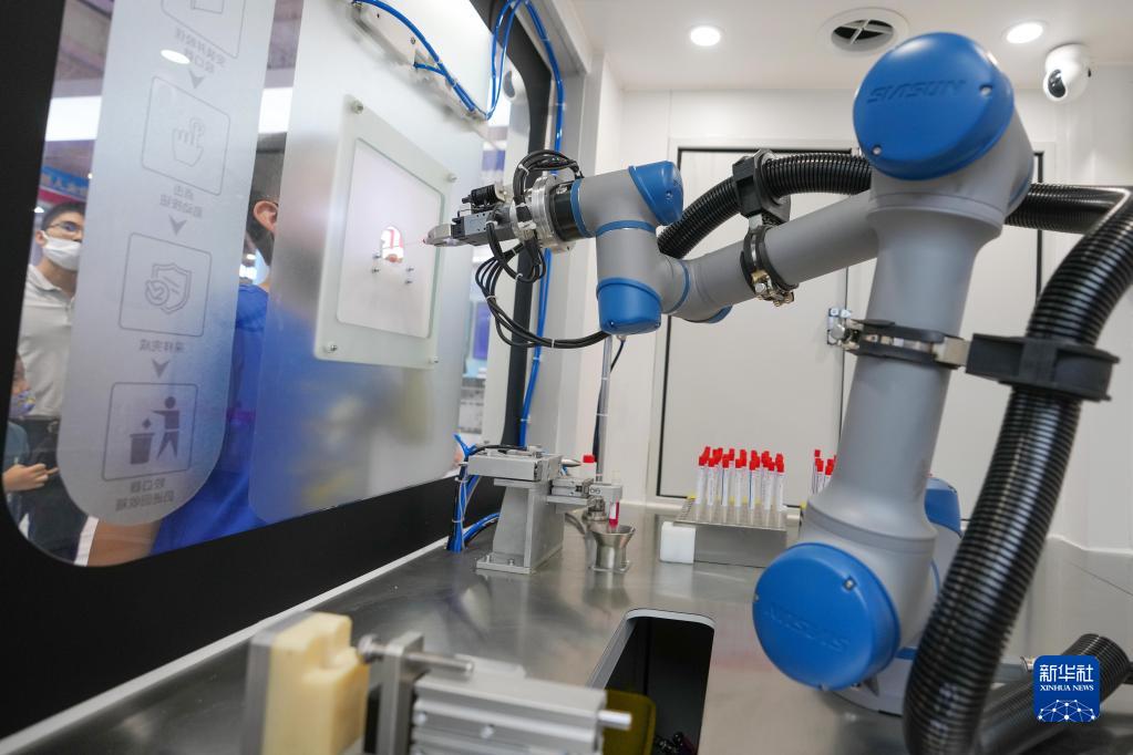 這是在2022世界機器人博覽會上拍攝的一款使用機器人進行采樣的便民核酸采樣亭(8月18日攝)。