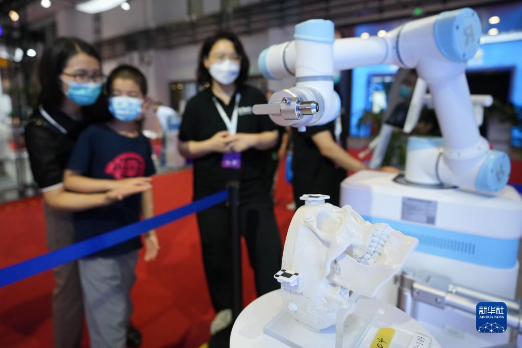 8月18日,參觀者在2022世界機器人博覽會上參觀一款手術機器人。