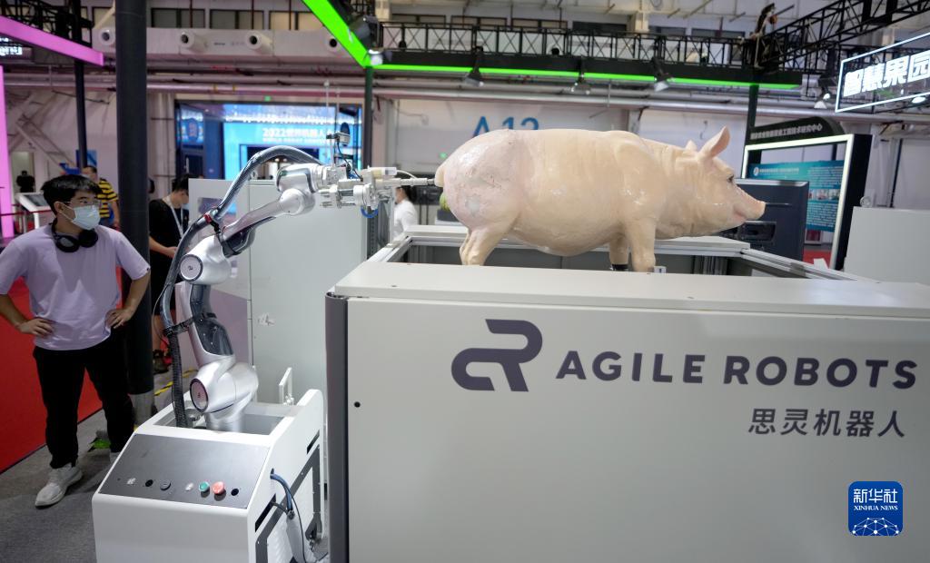 8月18日在2022世界機器人大會上拍攝的可以給豬注射疫苗的機器人。