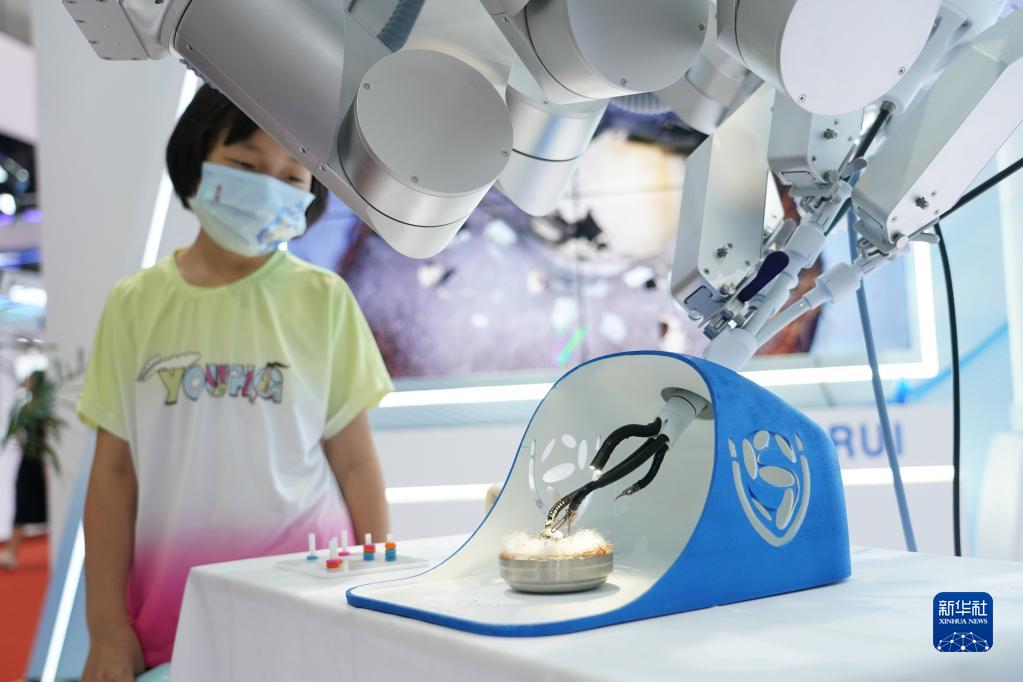 8月18日,在2022世界機器人博覽會現場,一名小朋友參觀單孔腔鏡手術機器人。