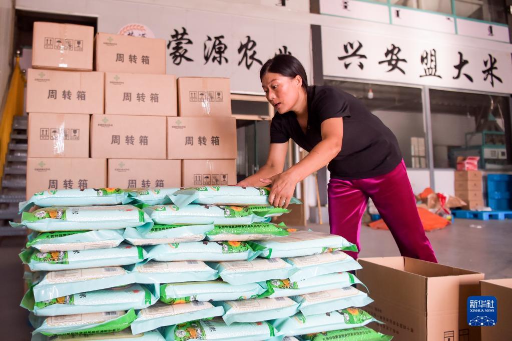 8月17日,在扎賚特旗好力保農業專業合作社的大米加工廠,宋春平將大米裝箱。