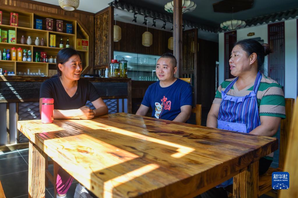 8月17日,在扎賚特旗好力保農業專業合作社內的農家樂,宋春平(左)與鄉親們交流。