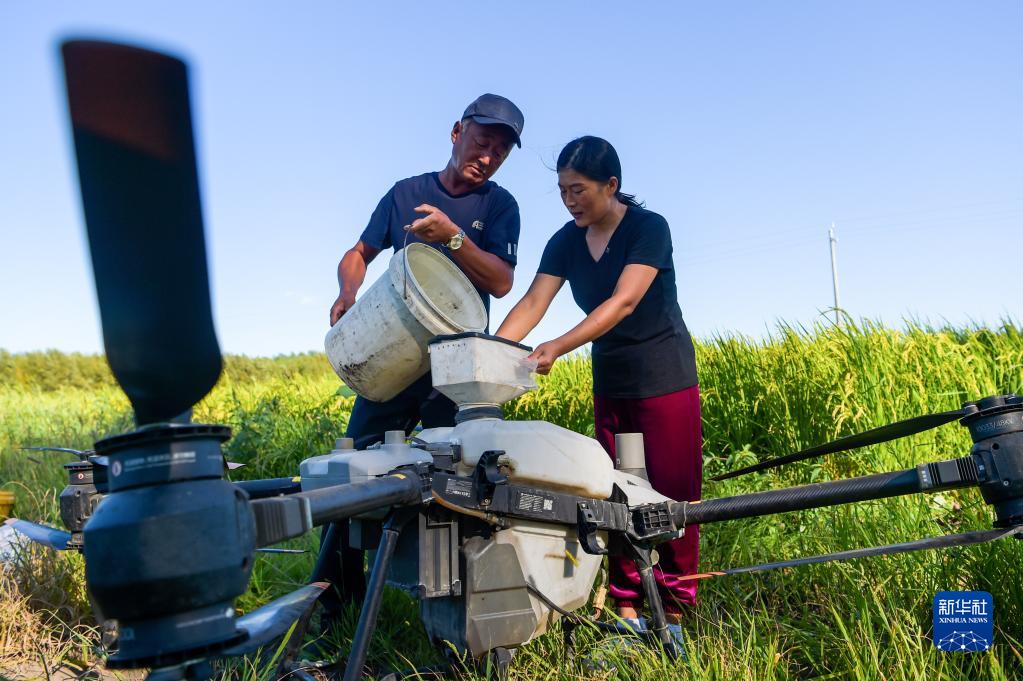 8月17日,在扎賚特旗先鋒村,宋春平(右)與水稻訂單種植戶開展施肥準備工作。