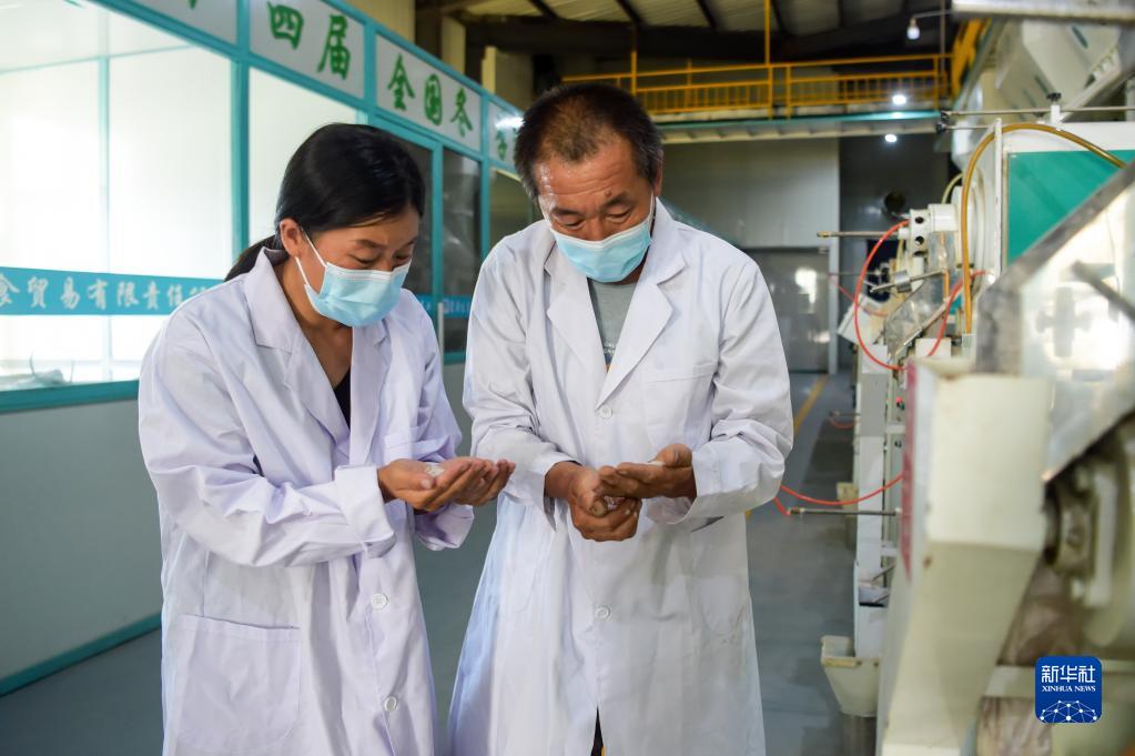 8月17日,在扎賚特旗好力保農業專業合作社的大米加工廠,宋春平(左)查看大米品質。