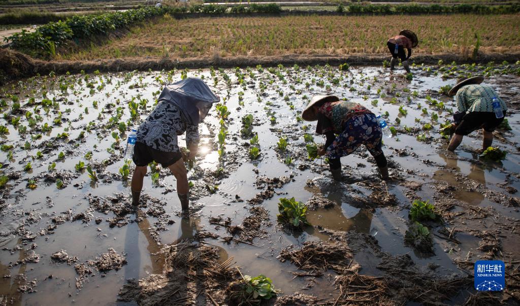 8月18日,在峨眉山市桂花橋鎮廟稿村,村民在水稻田里種植中藥澤瀉。
