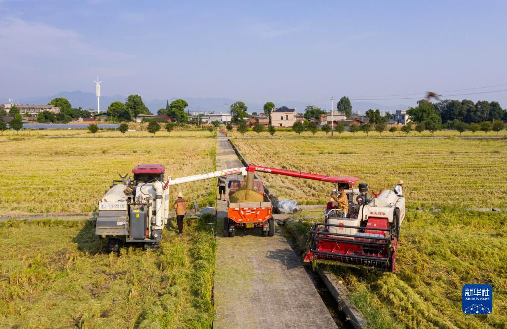 8月18日,在峨眉山市桂花橋鎮紅山村,工作人員操作收割機收獲水稻(無人機照片)。