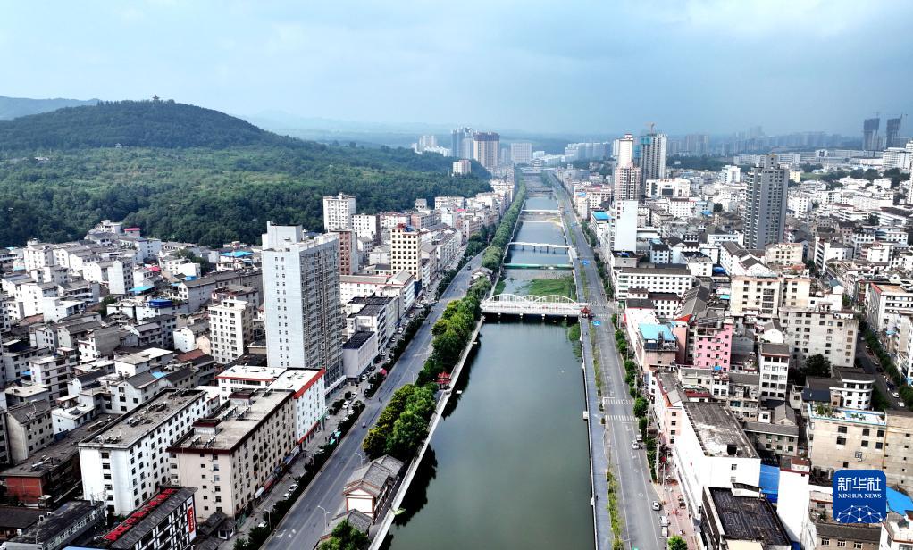 洛南縣的縣河穿城而過,治理后的河道流淌著清澈的河水(8月18日攝,無人機照片)。