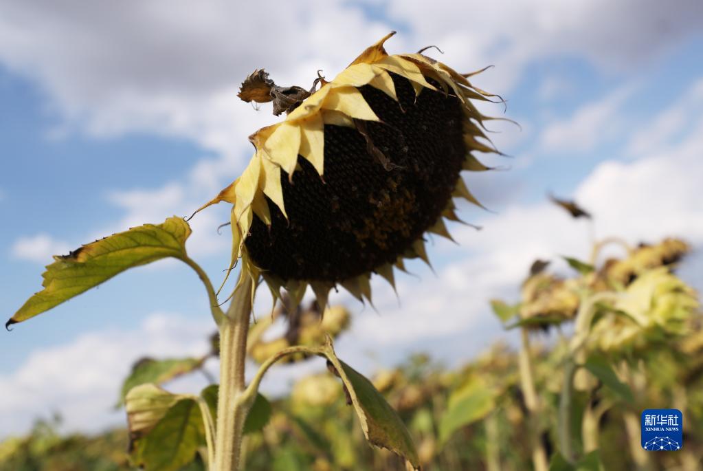 這是8月18日在法國巴黎西北約30公里處的皮伊塞-蓬圖瓦茲拍攝的受旱情影響的向日葵田。