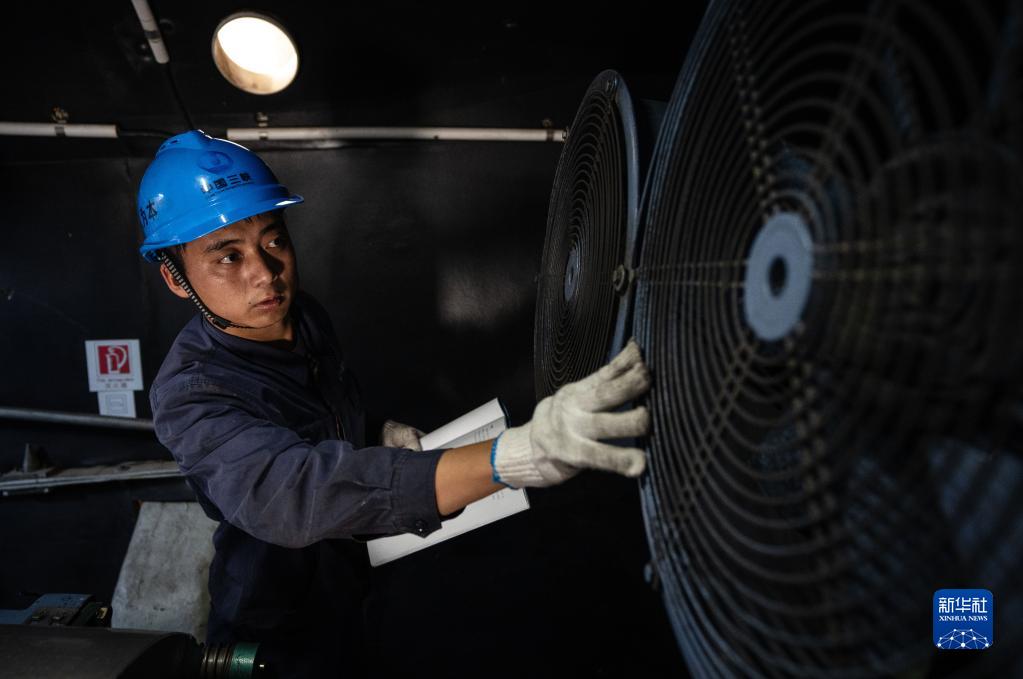 8月18日,三峽姚安發電場工程人員在風力發電機內進行檢修。